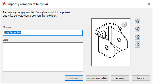 - Podczas wstawiania do rysunku obróć model wokół osi X, Y lub Z za pomocą przycisków Obróć.