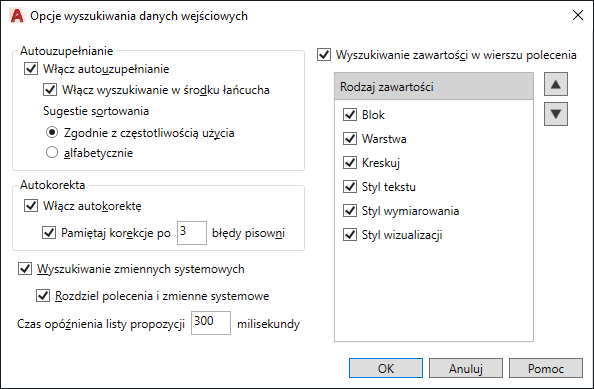 Steruje ustawieniami wyświetlania listy propozycji poleceń, zmiennych systemowych i nazwanej zawartości, takiej jak bloki i warstwy.