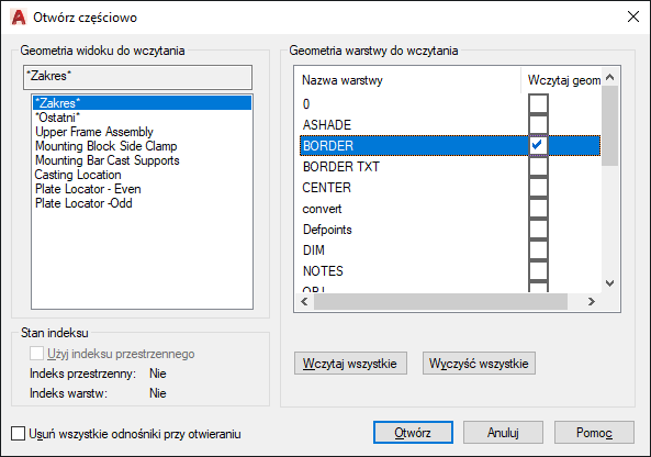 Można wybrać i wczytać geometrię z widoku lub wybranego obszaru lub z warstw. Nie można usunąć żadnych informacji aktualnie wczytanych do rysunku. Jeżeli rysunek zawiera dołączone odnośniki niewczytane podczas częściowego otwarcia rysunku, można ponownie wczytać odnośniki, korzystając z palety Odnośniki. Zobacz opis polecenia ODNOŚNIK.