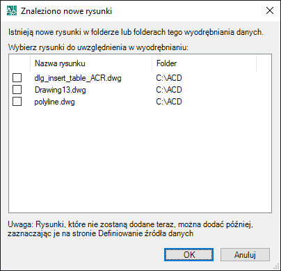 Wyświetla listę nowych rysunków dodanych do folderu wybranego do wyodrębniania danych po wykonaniu wyodrębniania.