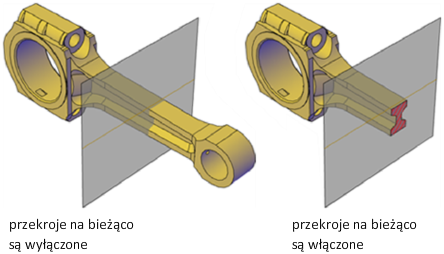 Obiekty przekroju działają jako płaszczyzny przekroju brył, powierzchni, siatek lub regionów. Gdy tworzenie przekrojów na bieżąco jest włączone i obiekt przekroju jest przesuwany przez model 3D, w czasie rzeczywistym wyświetlane są wewnętrzne szczegóły obiektów 3D, przez które przechodzi płaszczyzna przekroju. Same obiekty 3D nie ulegają zmianie przez wprowadzenie obiektów przekroju.