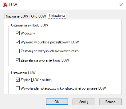 Umożliwia wyświetlenie, zmianę nazwy i przywrócenie definicji układu LUW oraz steruje układami LUW i ustawieniami ich ikon dla rzutni.