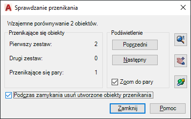 Wyświetla liczbę znalezionych przenikań między zaznaczonymi obiektami.