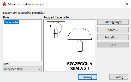 Wyświetla listę stylów szczegółu dostępnych w bieżącym pliku rysunku. Bieżący styl jest wyróżniony.