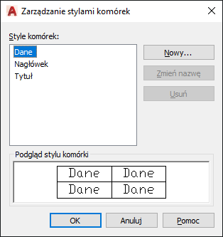 Wyświetla listę wszystkich stylów komórek zawartych w bieżącym stylu tabeli. Style komórek Tytuł, Nagłówek i Dane są zawsze zawarte w każdym stylu tabeli.