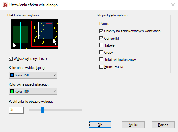 Steruje kolorami wybranego obszaru podczas wyboru oknem przecinającym. (CROSSINGAREACOLOR — zmienna systemowa)