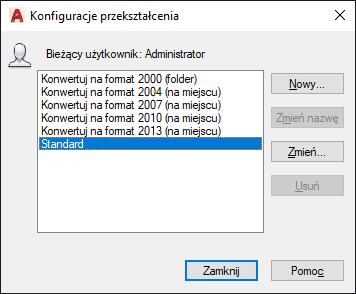 Wyświetla listę poprzednio zapisanych konfiguracji przekształcenia oraz konfigurację domyślną: Standardowa.
