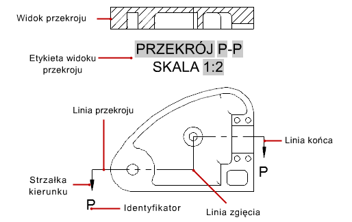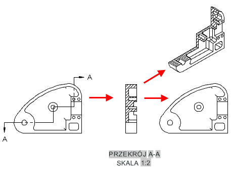 Przekrój dokumentacji modelu to rzut z istniejącego rzutu rysunkowego, w którym przy użyciu linii przekroju wykonywany jest przekrój przez rzut rysunkowy, aby pokazać to, co znajduje się wewnątrz.
