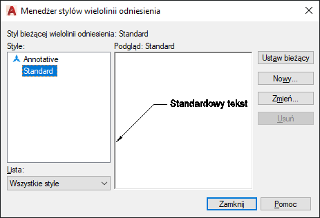 Ustawia jako bieżący styl wybrany z listy Style. Wszystkie nowe wielolinie odniesienia będą tworzone przy użyciu tego stylu.
