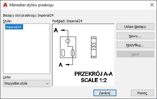 Wyświetla listę stylów przekroju dostępnych w bieżącym pliku rysunku. Bieżący styl jest wyróżniony.