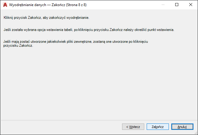 Tworzy tabelę wypełnianą wyodrębnionymi danymi. Po kliknięciu przycisku Zakończ na stronie Zakończ wyświetlany jest monit o wstawienie tabeli do bieżącego rysunku.