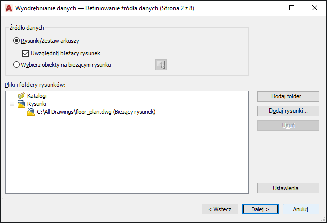 Określa pliki rysunku, w tym foldery, z których mają być wyodrębniane dane. Umożliwia wybór obiektów w bieżącym rysunku, z których należy wyodrębnić informacje.