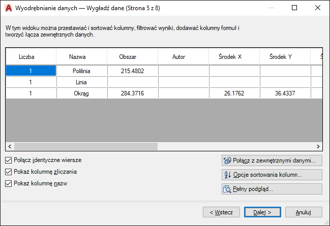 Te informacje są używane do utworzenia tabeli wyodrębniania danych w bieżącym rysunku lub zapisywane w zewnętrznym pliku.