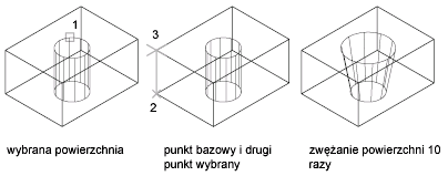 Zwęża powierzchnie bryły 3D pod określonym kątem. Obrót kąta zwężania jest określany według kolejności wyboru punktu bazowego i drugiego punktu wzdłuż wybranego wektora.