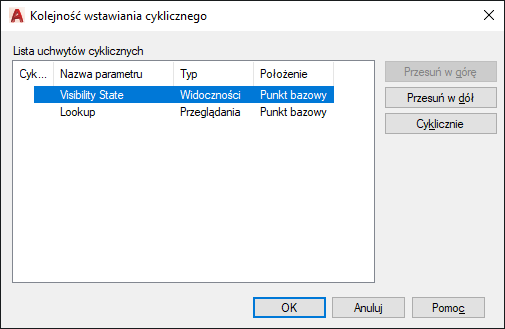 Wyświetla listę uchwytów w definicji bloku dynamicznego. Znacznik w kolumnie cyklicznej oznacza, że włączona jest opcja cykliczności dla tego uchwytu.