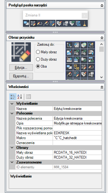 Panel Wyświetlanie dynamiczne zawiera podgląd elementu interfejsu użytkownika na panelu Dostosowywane pliki. Umożliwia edycję obrazu polecenia wybranego na panelu Lista poleceń oraz właściwości charakterystycznych dla elementu wybranego na panelu Dostosowywane pliki lub na panelu Lista poleceń.