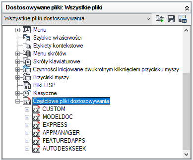W tym panelu można tworzyć i modyfikować elementy interfejsu użytkownika, takie jak karty i panele wstążki oraz pasek narzędzi szybkiego dostępu. Wzdłuż górnej krawędzi panelu znajdują się narzędzia, które mogą być używane do wczytywania częściowych plików adaptacji do głównego pliku adaptacji, zapisywania zmian we wczytanych plikach adaptacji oraz sterowania sposobem wyświetlania wczytanych plików adaptacji.