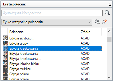 U góry panelu Lista poleceń znajduje się pole Wyszukaj na liście poleceń umożliwiające przefiltrowanie listy poleceń na podstawie wprowadzonego ciągu tekstowego. Ciąg tekstowy jest dopasowywany do dowolnej części nazwy polecenia, a wyniki są wyświetlane w polu Lista poleceń.
