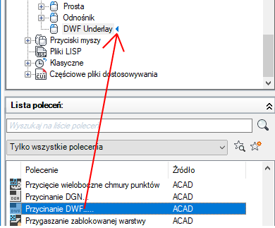 5. Jeśli chcesz zastąpić bieżące polecenie przypisane do operacji inicjowanej dwukrotnym kliknięciem przycisku myszy, przeciągnij polecenie z panelu Lista poleceń do operacji inicjowanej dwukrotnym kliknięciem przycisku myszy w panelu Dostosowywane pliki: <nazwa pliku>.