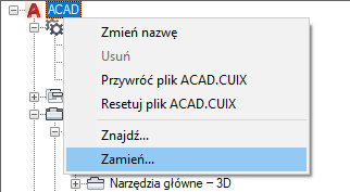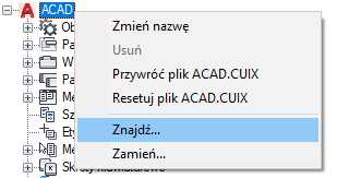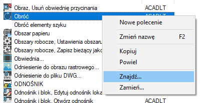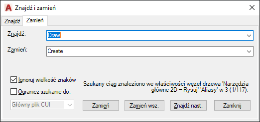 Zostanie wyświetlony komunikat, który określa lokalizację polecenia, jego dokładne położenie w panelu Dostosowywanie w lub panelu Właściwości oraz liczbę jego wystąpień.