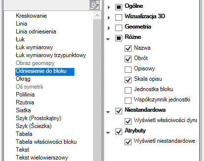 Gdy zaznaczone są kategorie Niestandardowe i Atrybuty, na palecie Szybkie właściwości są wyświetlane dynamiczne właściwości i atrybuty bloku.