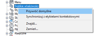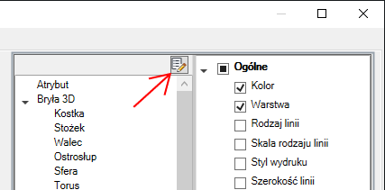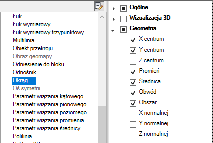 Jeśli typ obiektu jest zaznaczony, właściwości tego typu obiektu są wyświetlane na palecie Szybkie właściwości, gdy: wybrany jest obiekt tego samego typu, w zmiennej systemowej QPMODE ustawiona jest wartość 2 i włączona jest zmienna systemowa PICKFIRST. Usuń znacznik znajdujący się obok typu obiektu, aby usunąć wybrany typ obiektu z palety Szybkie właściwości.