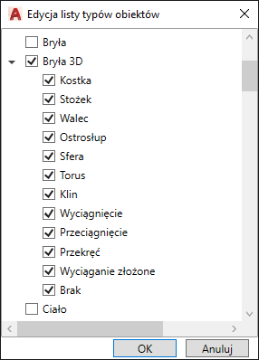 - W oknie dialogowym Edycja listy typów obiektów kliknij typy obiektów, których właściwości mają być wyświetlane na palecie Szybkie właściwości.
