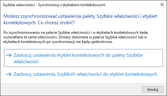 - Kliknij opcję Zastosuj ustawienia etykiet kontekstowych do palety Szybkie właściwości.