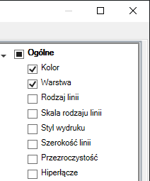 - Na panelu Właściwości zaznacz pola wyboru dostępne obok właściwości ogólnych, które będą wyświetlane na palecie Szybkie właściwości dla wszystkich typów obiektów.