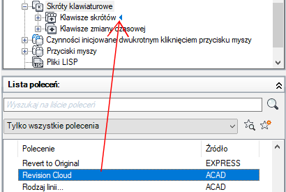 - Aby utworzyć klawisz skrótu, przeciągnij polecenie z panelu Lista poleceń do węzła Klawisze skrótów znajdującego się w panelu Dostosowywane pliki: <nazwa pliku>.