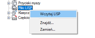 Na karcie Dostosuj w panelu Dostosowywane pliki: <nazwa pliku> kliknij prawym przyciskiem myszy węzeł Pliki LISP. Kliknij przycisk Wczytaj LISP.