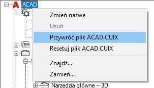 Uwaga: Resetować można tylko pliki CUIx znajdujące się w folderze UserDataCache w lokalizacji instalacji programu.
