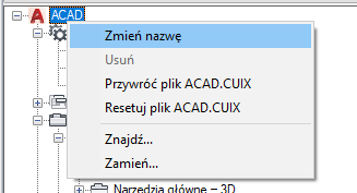 Za pomocą edytora Dostosuj interfejs użytkownika (CUIx) można tworzyć, resetować i przywracać pliki ustawień oraz zmieniać ich nazwy. Określ główne pliki ustawień lub korporacyjne pliki adaptacji.