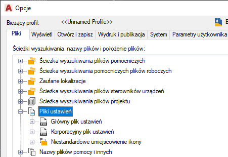 - W oknie dialogowym Opcje, na karcie Pliki kliknij znak plus (+) obok pola Pliki ustawień, aby rozwinąć listę.