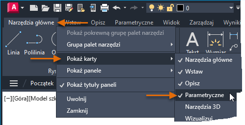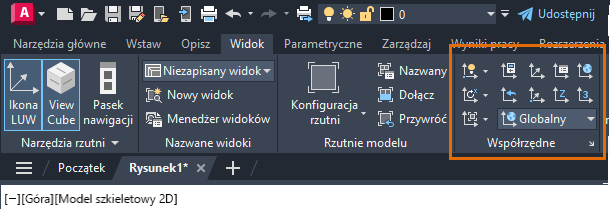 W tym ćwiczeniu zostaną ukryte karty wstążki Parametryczne i zostanie wyświetlony panel Współrzędne na karcie Widok.