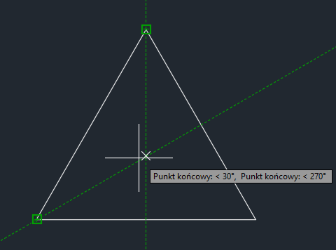 Domyślnie śledzenie lokalizacji względem obiektu jest śledzeniem tylko ortogonalnym. Można jednak zmienić ustawienia funkcji śledzenia lokalizacji względem obiektu, aby używała ona wszystkich ustawień kątów biegunowych. Załóżmy, że tym razem okrąg ma być narysowany w punkcie środkowym tego trójkąta przy użyciu funkcji śledzenia lokalizacji względem obiektu.