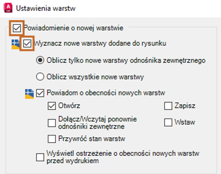 3. Upewnij się, że w oknie dialogowym Ustawienia warstwy zaznaczone jest pole Powiadomienie o nowej warstwie, a następnie wybierz opcję Wyznacz nowe warstwy dodane do rysunku.