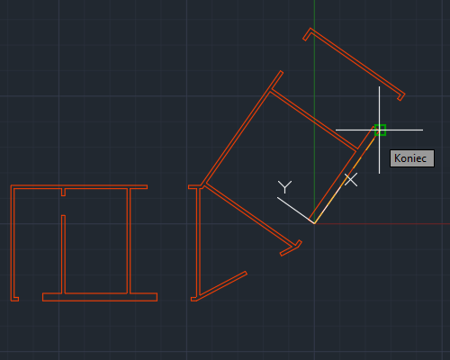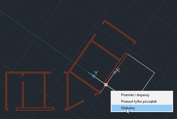 Podczas przesuwania początku układu LUW siatka rysunku również przesuwa się i dostosowuje swoją orientację do nowego początku. Główne linie osi siatki pokazują dodatnie kierunki osi X (czerwona linia) i Y (zielona linia).