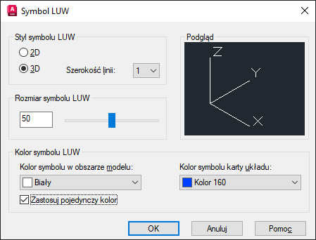 | LUWSYMB | Umożliwia sterowanie widocznością i położeniem ikony układu LUW. | 3 | Rysunek |
