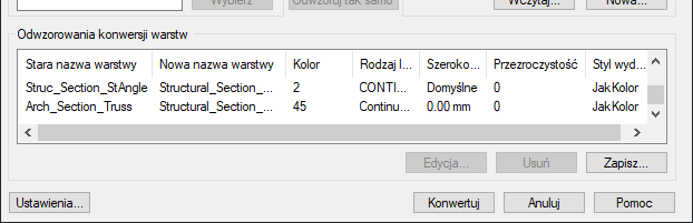 W sekcji Zestawienie konwersji warstw wybierz opcję Struc_Section_Dim w kolumnie Nazwa starej warstwy i kliknij przycisk Edytuj.