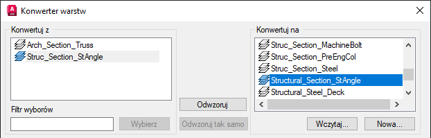 Z listy Konwertuj z wybierz opcję Struc_Section_stAngle, a następnie z listy Konwertuj na wybierz opcję Structural_Section_StAngle. Kliknij przycisk Mapuj.