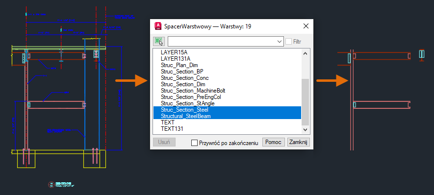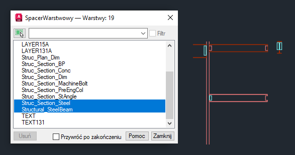 Zwróć uwagę, że na rysunku widoczne są tylko warstwy Struc_Section_Steel i Structural_SteelBeam.