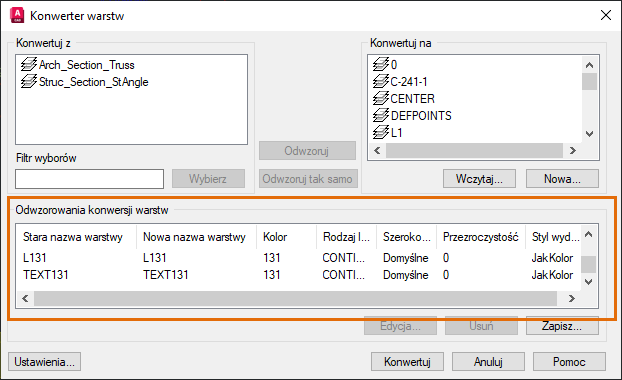 Wszystkie warstwy o takich samych nazwach na dwóch rysunkach są dodawane do sekcji Zestawienie konwersji warstw w dolnej części okna dialogowego. Powinny teraz pozostać dwie nieodwzorowane warstwy.