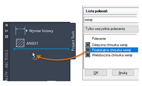 Powyżej podano sposób tworzenia narzędzi z istniejących obiektów rysunkowych. Można również tworzyć narzędzia z ulubionych poleceń. Przykładowo można dodać do palety narzędzi polecenie Prostokątna chmurka wersji i tak je dostosować, aby podczas używania narzędzia określona warstwa była ustawiana jako bieżąca. Używając tej techniki, można szybko tworzyć niestandardowe wersje ulubionych narzędzi.
