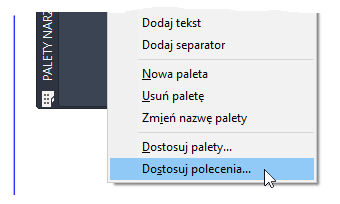 Uwaga: Można tworzyć niestandardowe polecenia za pomocą edytora Dostosuj interfejs użytkownika (CUI) i dodawać je do palety narzędzi lub nawet do wstążki.