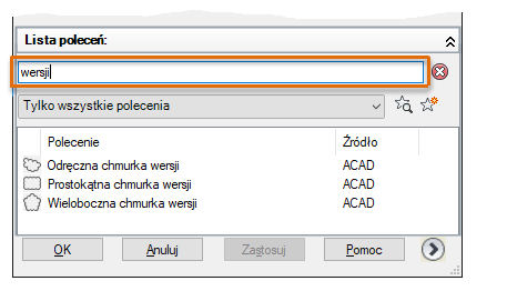 W edytorze Dostosuj interfejs użytkownika (CUI), w panelu Lista poleceń, kliknij w polu tekstowym Wyszukaj na liście poleceń i wpisz tekst wersji.