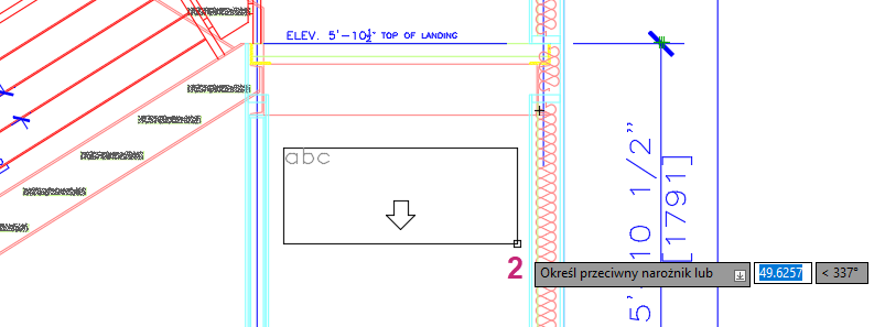 8. W obszarze rysunku określ pierwszy narożnik (1) ramki ograniczającej obiektu WTekst w obszarze pod schodami.