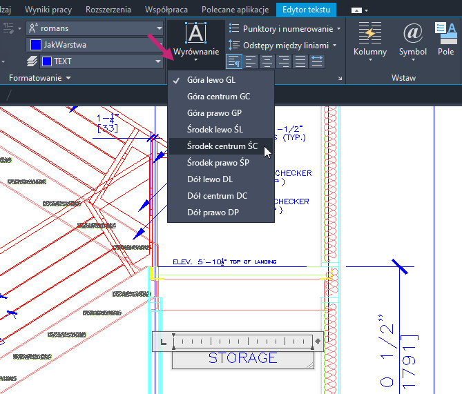 13. Na karcie Edytor tekstu kliknij panel Akapit > menu rozwijane Wyrównanie > Środek centrum ŚC.