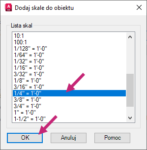 5. W oknie dialogowym Dodaj skale do obiektu wybierz z listy skalę 1/4"=1'-0" i kliknij dwukrotnie przycisk OK, aby dodać skale opisu.