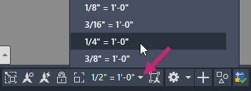 7. Po odblokowaniu rzutni kliknij przycisk Skala rzutni na pasku stanu i wybierz z listy opcję 1/4"=1'-0".